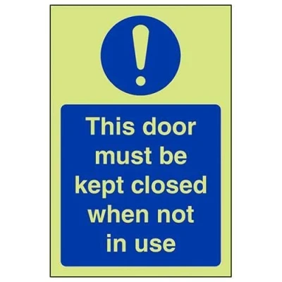 Helps to fulfil obligations to show vital escape route information about fire doors for all employees and visitors as per Health and Safety (Safety Signs & Signals) Regulations 1996 Conforms to EN ISO 7010:2012 Portrait Orientation. Sign reads "This Door Must Be Kept Closed When Not In Use" Highly durable Glow In The Dark Self Adhesive Vinyl and screen printed message will stand the test of time Sign measures 150 x 200mm. Self Adhesive material will adhere securely to most surfaces