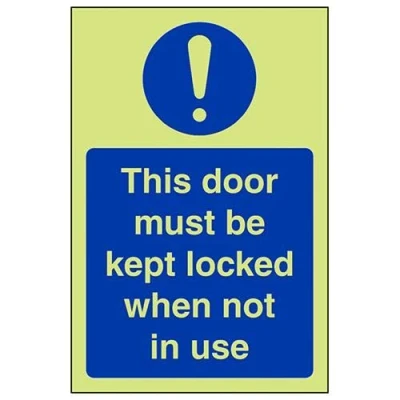 Helps to fulfil obligations to show vital escape route information about fire doors for all employees and visitors as per Health and Safety (Safety Signs & Signals) Regulations 1996 Conforms to EN ISO 7010:2012 Portrait Orientation. Sign reads "This Door Must Be Kept Locked When Not In Use" Highly durable Glow In The Dark Self Adhesive Vinyl and screen printed message will stand the test of time Sign measures 100 x 150mm. Self Adhesive material will adhere securely to most surfaces