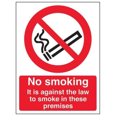 Clearly establishes areas where smoking is prohibited to employees and visitors. Complies with the Smoke-free (Signs) Regulations 2007 Conforms to EN ISO 7010:2012 - Prohibition signs feature a red circular symbol of at least 35% of the total sign area, on a white background, with a black pictogram Portrait Orientation. Sign reads "No Smoking. It Is Against The Law To Smoke In These Premises" Highly durable and heavy duty 2mm rigid plastic material Sign measures 200 x 300mm