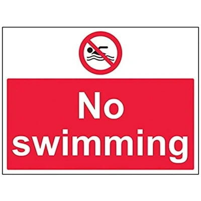 Clearly displays prohibited and potentially dangerous actions which employees and visitors must avoid in the interests of health and safety as per Health and Safety (Safety Signs & Signals) Regulations 1996 Conforms to EN ISO 7010:2012 - Prohibition signs feature a red circular symbol of at least 35% of the total sign area, on a white background, with a black pictogram Landscape Orientation. Sign reads "No Swimming" Highly durable 1mm plastic material and screen printed message will stand the test of time Sign measures 400 x 300mm