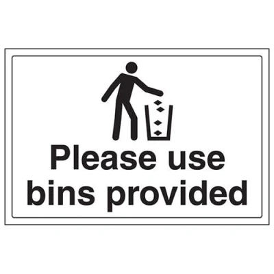 Landscape Orientation. Sign reads "Please Use Bins Provided" Highly durable 1mm plastic material and screen printed message will stand the test of time Sign measures 300 x 200mm 0 0
