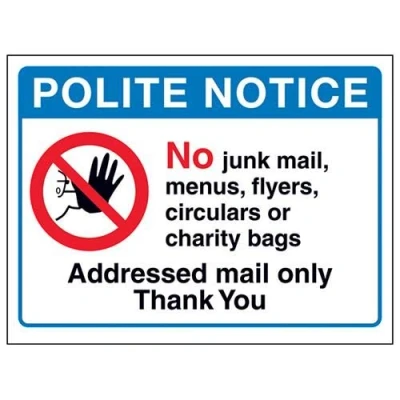 VSafety Polite Notice: No Junk Mail, Addressed Mail Only Sign 200mm x 150mm Window Sticker