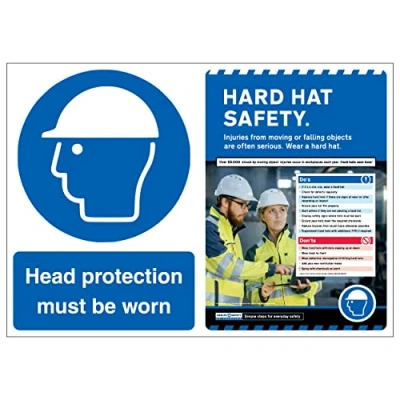 Keep staff and visitors safe – ISO compliant sign warns staff and visitors that head protection must be worn, and the poster alongside it provides relevant safety guidance Get an ISO compliant sign and safety poster all in one – no need to buy separately! Increase health and safety awareness in your workplace Made from durable materials that will last for years in any environment, Easy to keep clean – keeps your sign/poster combo looking fresh and new Available in fully recyclable Standard 0.2mm Flexi-Plastic or 2mm Rigid Plastic 2mm Rigid Plastic sign/poster combo's are supplied with self-adhesive tabs for affixing