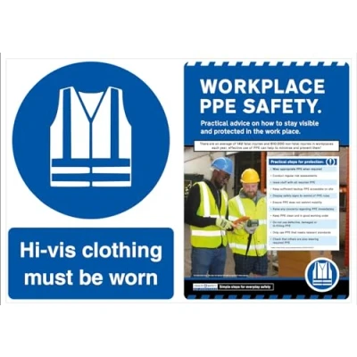 Keep staff and visitors safe – ISO compliant sign warns staff and visitors that hi-vis clothing must be worn, and the poster alongside it provides relevant safety guidance Get an ISO compliant sign and safety poster all in one – no need to buy separately! Increase health and safety awareness in your workplace Made from durable materials that will last for years in any environment, Easy to keep clean – keeps your sign/poster combo looking fresh and new Available in fully recyclable Standard 0.2mm Flexi-Plastic or 2mm Rigid Plastic 2mm Rigid Plastic sign/poster combo's are supplied with self-adhesive tabs for affixing