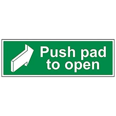 Helps to fulfil legal obligations to inform of the direction in which safety can be reached as per Health and Safety (Safety Signs & Signals) Regulations 1996 Conforms to EN ISO 7010:2012 by featuring a green background with a white pictogram or text positioned centrally Landscape Orientation. Sign reads "Push Pad To Open" Highly durable 1mm plastic material and screen printed message will stand the test of time Sign measures 600 x 200mm