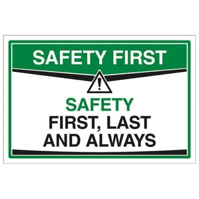 Demonstrate your company’s commitment to safety with this safety first sign Send the right message quickly and efficiently Increase safety consciousness among employees - simple sign message that helps prevent accidents Focus on positive behaviours and motivate employees Printed on high quality flexible gloss-finished self adhesive vinyl material that is suitable for use on smooth, clean, non-porous surfaces