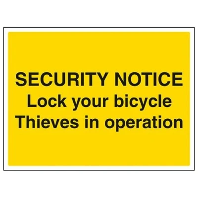 Helps to fulfil legal obligations to inform employees, visitors and the general public of potential hazards as per Health and Safety (Safety Signs & Signals) Regulations 1996 Conforms to EN ISO 7010:2012 - Warning signs feature a triangular symbol with a black pictogram and yellow background occupying at least 50% of the total sign area Landscape Orientation. Sign reads "Security Notice. Lock Your Bicycle. Thieves In Operation" Highly durable Self Adhesive Vinyl material and screen printed message will stand the test of time Sign measures 400 x 300mm. Self Adhesive material will adhere securely to most surfaces