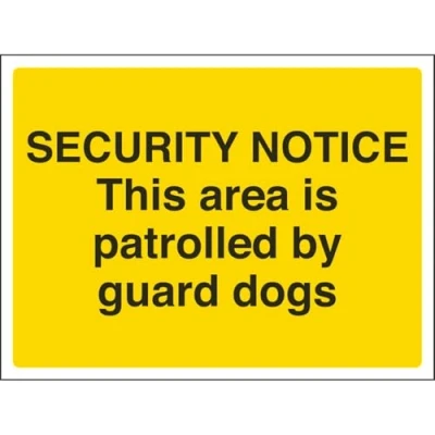 Helps to fulfil legal obligations to inform employees, visitors and the general public of potential hazards as per Health and Safety (Safety Signs & Signals) Regulations 1996 Conforms to EN ISO 7010:2012 - Warning signs feature a triangular symbol with a black pictogram and yellow background occupying at least 50% of the total sign area Landscape Orientation. Sign reads "Security Notice. This Area Is Patrolled By Guard Dogs" Highly durable 1mm plastic material and screen printed message will stand the test of time Sign measures 200 x 150mm