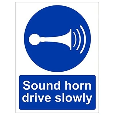 Helps to fulfil legal obligations to remind staff and visitors to wear the appropriate PPE when required to ensure personal safety as per Health and Safety (Safety Signs & Signals) Regulations 1996 Conforms to EN ISO 7010: 2012 - Mandatory Signs feature a round symbol with a blue background of at least 50% of the total sign area, with a white pictogram and text Portrait Orientation. Sign reads "Sound Your Horn Drive Slowly" Printed on strong 2mm thick white High Impact Polystyrene (HIPS) plastic - ideal for outdoor use