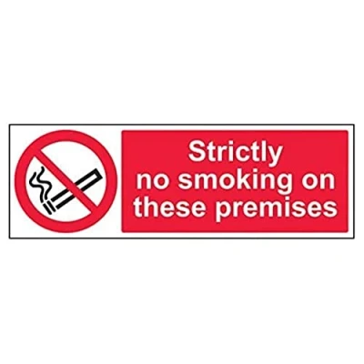 Clearly establishes areas where smoking is prohibited to employees and visitors. Complies with the Smoke-free (Signs) Regulations 2007 Conforms to EN ISO 7010:2012 - Prohibition signs feature a red circular symbol of at least 35% of the total sign area, on a white background, with a black pictogram Landscape Orientation. Sign reads "Strictly No Smoking On These Premises" Highly durable Self Adhesive Vinyl material and screen printed message will stand the test of time Sign measures 450 x 150mm. Self Adhesive material will adhere securely to most surfaces