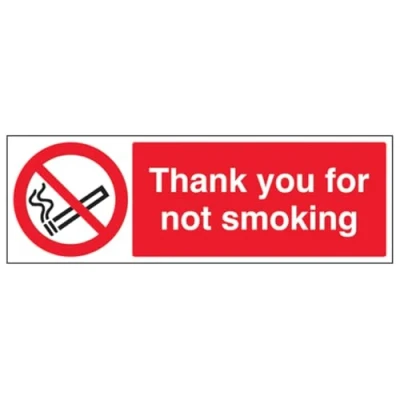 Clearly establishes areas where smoking is prohibited to employees and visitors. Complies with the Smoke-free (Signs) Regulations 2007 Conforms to EN ISO 7010:2012 - Prohibition signs feature a red circular symbol of at least 35% of the total sign area, on a white background, with a black pictogram Landscape Orientation. Sign reads "Thank You For Not Smoking" Highly durable 1mm plastic material and screen printed message will stand the test of time Sign measures 300 x 100mm