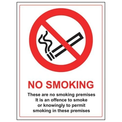 Clearly establishes areas where smoking is prohibited to employees and visitors. Complies with the Smoke-free (Signs) Regulations 2007 Conforms to EN ISO 7010:2012 - Prohibition signs feature a red circular symbol of at least 35% of the total sign area, on a white background, with a black pictogram Portrait Orientation. Sign reads "No Smoking. These Are No Smoking Premises. It Is An Offence To Smoke or Knowingly To Permit Smoking In These Premises." Highly durable 1mm plastic material and screen printed message will stand the test of time Sign measures 300 x 400mm