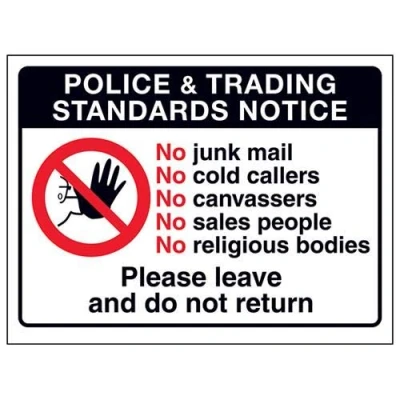VSafety Trading Standards: No Junk Mail or Cold Callers Sign 200mm x 150mm Window Sticker
