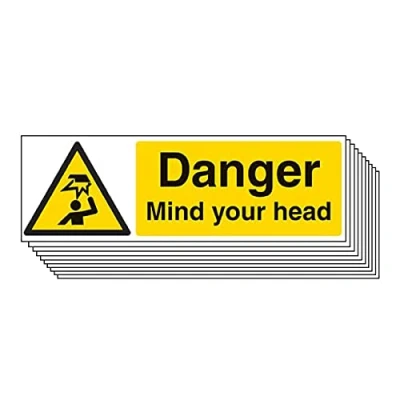 Helps to fulfil legal obligations to inform employees, visitors and the general public of potential hazards as per Health and Safety (Safety Signs & Signals) Regulations 1996 Conforms to EN ISO 7010:2012 - Warning signs feature a triangular symbol with a black pictogram and yellow background occupying at least 50% of the total sign area Landscape Orientation. Sign reads "Danger. Mind Your Head" Highly durable Self Adhesive Vinyl material and screen printed message will stand the test of time Sign measures 300 x 100mm. Self Adhesive material will adhere securely to most surfaces