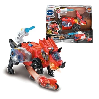 Spanish version. Dinosaur and action figures, transformable toy for children + 3 years. Start or expand your Switch&Go Dinos collection with Salvador the VTech fire engine Triceratops! Turn your dinosaur into a fire engine and launch the Moto VT-09 to help the rescue! DINO-CAR: Easy and quick conversion from dinosaur to fire engine. Three buttons to interact: voices, action and special effects. Teaches recent facts about this type of dinosaurs as well as information of interest. Motion sensor to activate steps, roars or spills depending on the occasion. Light effects simulate a hose in the fire engine and dinosaur accompany the voices and sounds. We take care of the planet. At VTech, we work to reduce our environmental impact as part of an environmentally conscious approach. International products have separate terms, are sold from abroad and may differ from local products, including fit, age ratings, and language of product, labeling or instructions., Manufacturer: VTech