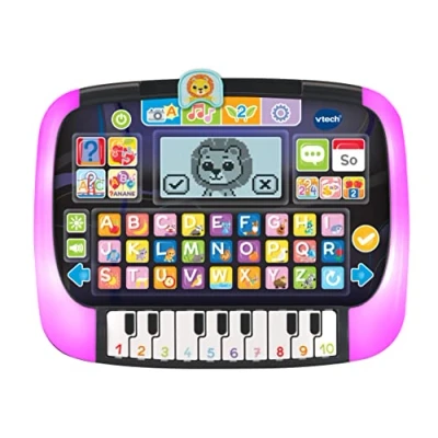 BRIGHT LEARNING AND PLAYING FUN: a cute lion guides through the activities in a playful way, gets to know letters, first words and numbers with the child, and the frame lights up in 4 colors The learning tablet impresses with 8 educational games, including 4 exciting games on the themes of letters, letter sounds and spelling and 4 tricky games about numbers, counting, larger and smaller With the piano and letter keys, the child can make music, the calendar helps to get to know the days of the week, and the camera button triggers great camera sounds The robust children's tablet promotes language development, musical and mathematical understanding and invites imaginative play. With volume control and automatic switch-off Box contents: 1 x Vtech baby learning and music tablet, with 10 background melodies for switching on and off, German version 2-5 years, 2 x AA/LR6 batteries included, item no. No.: 80-551704, Manufacturer: Vtech