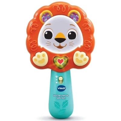 Version: French Age: Baby rattle recommended for 9-36 months toddlers. Mirror: Baby looks at himself to discover her own reflection and has fun adding the lion face over her image. The mirror lights up to delight your baby. When he plays with it, Timon the lion magically appears and sings a song to him. Interactive: 3 buttons including a light up to make the lion appear in the mirror and hear fun phrases and sounds. Includes: + 50 songs, melodies, sounds and phrases / Automatic shut-off / Volume control / Handle designed for little hands.