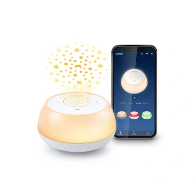 JoybuyThe VTech V-Hush BC8213 Mini Sleep Soother features a ceiling projector, 40 pre-loaded sounds, a multi-color night light, and Bluetooth connectivity for personalized bedtime routines. It allows recording of custom content and is designed for safe, soothing sleep experiences.