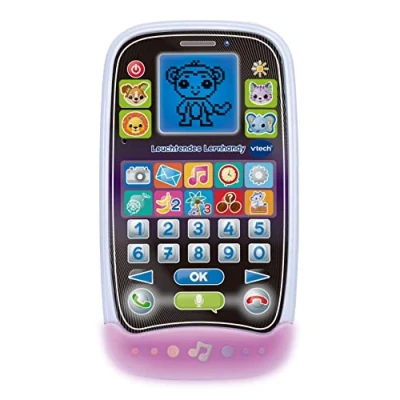 Learn and make calls with animal friends: the child-friendly toy phone impresses with 12 different activities and games such as Call animal friends, send emails, stroke play and smilies The animal friends are called via 4 animal buttons and by pressing one of the 10 app buttons, the child gets to play, emails and more. When calls, the mobile phone lights up in different colours Promotes mathematics understanding, listening comprehension and language development: learning content on numbers, counting, logic and time concepts are brought closer to play/the microphone invites you to interactive role play The illuminated screen is equipped with cute animations and the game mobile phone provides a varied activity with 5 ringtones, 3 sung songs and 10 melodies Box contents: 1 x VTech luminous learning mobile phone / with 10 game and learning apps / robust design / German version / age: 3-6 years / 2 x AA / LR6 demo batteries / item No.: 80-529204, Manufacturer: VTech