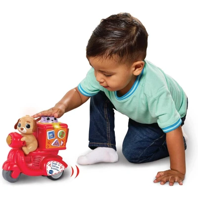 The VTech Dash 'n' Deliver Scooter Toy is an interactive ride-on designed for kids 12 months and up, featuring Puppy and Kitty for imaginative pizza delivery play, music, and educational buttons that teach numbers, colors, and foods, while encouraging creative and active skill-building. Batteries included.