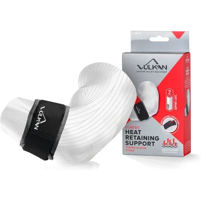 The Vulkan Classic Tennis Elbow Strap is ideal for use during sports activities where receptive strain injury is a concern, such as tennis, golf and other racket sports. The tennis elbow support is adjustable and has a removable strap which can provide additional compression of the forearm muscles and tendons around the elbow.. Made using aerotherm technology, this one-size-fits-all strap provides level 2 firm compression along with the therapeutic benefits of heat retention offered by neoprene. Comfortable for day wear, this tennis elbow strap is great for relieving the symptoms of muscle pain, sprains and strains.