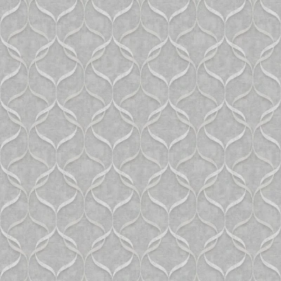 A textured weave effect vinyl wallcovering with a retro style geometric vertical interlocking wave design. Co-ordinating plain available. Shown in the silver grey colourway.