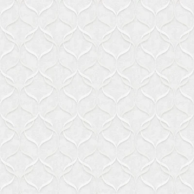 A textured weave effect vinyl wallcovering with a retro style geometric vertical interlocking wave design. Co-ordinating plain available. Shown in the white colourway.