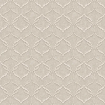 A textured weave effect vinyl wallcovering with a retro style geometric vertical interlockingwave design. Co-ordinating plain available. Shown in the beige colourway.