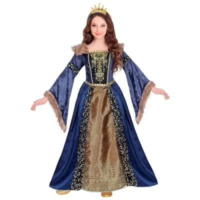 Elegant princess costume: consisting of a dark blue dress with underskirt and crinoline With golden crown: for an all-round royal appearance Designed with detail: faux fur trims and gold embellishments provide an authentic medieval look Size 164 cm: suitable for teenagers aged approx. 14 - 16 years Multi-purpose: suitable for fancy dress, medieval parties, theatre or birthday parties, Manufacturer: Widmann S.r.l.