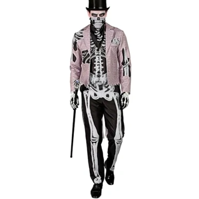 This costume is the ideal choice for Halloween parties and other creepy events where you want to attract attention as a skeleton groom The costume for adults is available in size XL You will receive a stylish tailcoat, a vest, trousers and a creepy mask - everything you need for a successful skeleton groom look The black vest and trousers are printed on the front and back with a detailed white skeleton that ensures a scary real appearance The grey tailcoat with jagged cut hem reveals the skeleton underneath in different places, such as the arms and shoulders, making it a real eye-catcher, Manufacturer: W WIDMANN MILANO Party Fashion