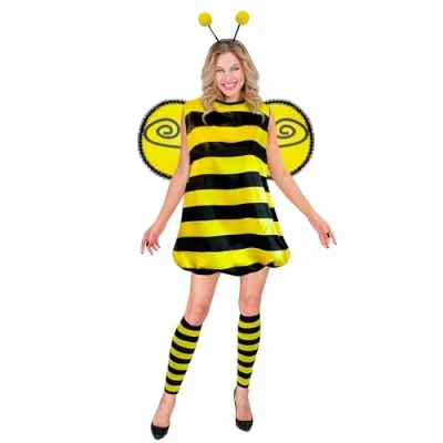 This bee costume for women includes a dress, cuffs, wings and a headband with tensioners The whole outfit is striped in black and yellow for an authentic look The wings are a real eye-catcher held together by the flower The costume is available for adults in size L/XL Ideal for carnival or theme parties - this costume set will attract everyone's attention, Manufacturer: Widmann S.r.l.