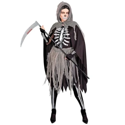 The Grim Woman costume contains everything you need for an impressive appearance: dress, tights, gloves, cape with hood and chains The grey shred look of the cape and dress provides a scary and creepy effect that makes a sensation The top, gloves and tights are decorated with a distinctive bone print that gives your look an extra shower The costume for adults is available in size M This costume is the ideal choice for Halloween, spooky parties or any event where a scary appearance is required, Manufacturer: W WIDMANN MILANO Party Fashion