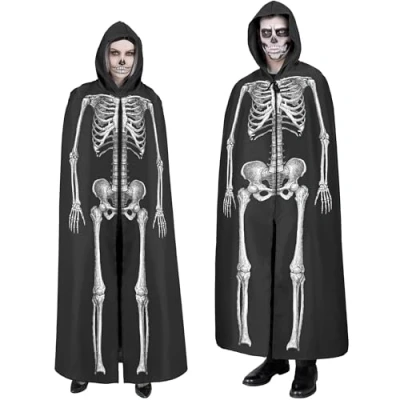 The black cape with the detailed white skeleton print on the front ensures an authentic and scary Halloween appearance With a length of 150 cm, the cape is equally suitable for men and women This costume is comfortable to wear and ideal for colder days as you can wear several layers of normal clothing underneath Round off the skeleton outfit ideally by combining it with a mask (not included) or applying make-up to match your face Ideal for Halloween parties and spooky events - this costume will make you stand out and goose bumps, Manufacturer: W WIDMANN MILANO Party Fashion