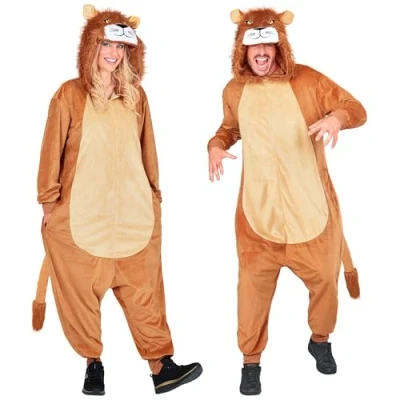 Cuddly plush look: the brown jumpsuit made of soft fabric with mane, tail and light belly fur makes a real eye-catcher - whether at carnival, at themed parties or cosy at home Unisex cut in L/XL: loose cut and comfortable to wear - the front zip allows for quick putting on and taking off Lion face hood: the attached hood features a striking lion face with ears, mane and snout - an eye-catching eye-catcher for anyone who wants to appear with humour MULTIPURPOSE Whether as a fun pajamas, fancy dress for parades or casual outfit at festivals, this animal onesie is the right companion for many occasions Partner and group costume: for joint performances with friends, family or as a couple costume - the lion motif brings fun to every round and makes groups easily recognisable, Manufacturer: Widmann S.r.l.