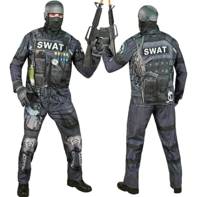 Realistic appearance: the detailed print with badges, equipment and protective plates gives the costume an authentic look and ensures an impressive effect Comfort and fit: made of lightweight polyester and available in XXL size, the swimsuit fits comfortably and offers sufficient freedom of movement, even during longer events READY TO USE: This set is more than just a disguise, it's a smart costume where all components are included in the package, just wear it and you're ready to get on the scene COMPLETE SET - The set includes top, pants, gloves and mask, all garments are coordinated with each other and create a uniform SWAT look Impressive on any occasion: whether it's Halloween, carnival or a themed party, this costume is a real eye-catcher, creates a good atmosphere and remains imprinted in the memory, Manufacturer: Widmann S.r.l.