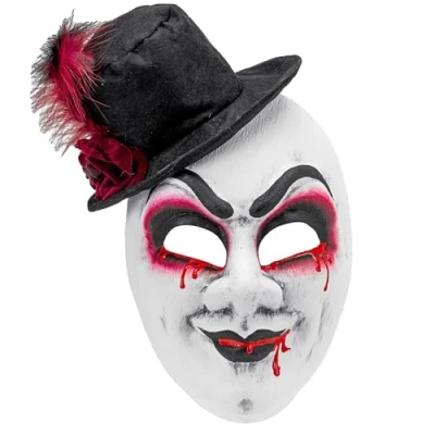 Scary elegance: white mask in porcelain doll look - detailed and with bloody eye effects for the ultimate scary factor With hat and decoration: black hat with red rose and elegant feather - perfectly matched for an incredibly stylish appearance Facial features: thick, dark eyebrows, black lips and the effect of blood running out of the mouth give the mask a particularly dark and terrifying radiance Versatile costume accessory: can be combined with different outfits - transform yourself into a killer clown, a fearsome pantomime or a horror doll in no time at all For any scary occasion: suitable for Halloween, carnival, or cosplay to make you eye-catching, Manufacturer: Widmann S.r.l.