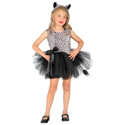 The tank top is made of a soft and pleasant to the touch fabric, with the typical spotted pattern, to imitate the leopard's coat The costume is embellished with a cute tulle tutu, with a black bow that adds an elegant and feminine touch The long, soft tail completes the effect, giving the costume an even more realistic and fun look The costume is enriched by a soft and comfortable headband, with leopard ears, which will give an irresistible touch of sympathy and realism Size: 110 cm / 3-4 years. Item code: 10364, Manufacturer: Widmann