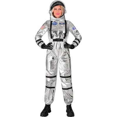 Size: This authentic astronaut suit for women is available in size M Practical details: two pockets for small items and the zip on the front offer good wearing comfort Cool design: shiny silver jumpsuit with different space patch patches as well as waist and shoulder straps Headgear included: The soft helmet with sewn-on headphones perfectly complements the suit and lets you slip into the role of an astronaut Accessories sold separately: the black gloves are not included but can be purchased separately to complete the outfit, Manufacturer: Widmann S.r.l.