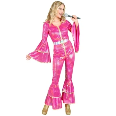 Shiny jumpsuit: figure-hugging one-piece in shimmering pink with typical 70s look EYE CATCHING DETAILS Wide flared sleeves and tiered style pant legs with gold trim BELT INCLUDED: Color matching waist belt with decorative buckle for an authentic disco style Size XL: comfortable cut with stretch content for comfortable wearing and plenty of freedom of movement FRONT ZIPPER: individually adjustable neckline for a personal look - from subtle to eye-catching, Manufacturer: Widmann S.r.l.