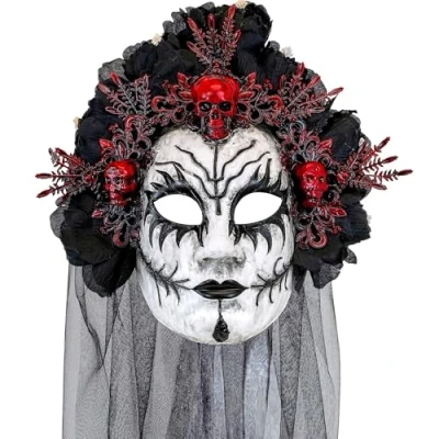 EYE CATCHING DESIGN: Detailed decorated mask in black and white with ornate ornaments and red accents for an unforgettable appearance ELEGANT ORNAMENTS: framed by black roses and red skull decorations that create a mystically dramatic look With long veil: the black sheer fabric veil adds mysterious elegance and completes the overall look MULTIPURPOSE Use for Halloween, a masquerade ball, carnival, gothic events or theme parties For adults: stylish eye-catcher that completes any costume impressively, Manufacturer: Widmann S.r.l.