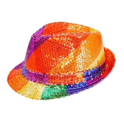 The fedora hat in rainbow colours with shimmering sequins makes for an unforgettable appearance Suitable for men and women, this headpiece is the ideal accessory for anyone who wants to make a fashion statement The sequins reflect the light and make the hat shine in the party light with each of your movements Whether festival, costume party or carnival – the hat rounds off your outfit perfectly and fits any extravagant event Unleash your inner party animal and show off your wild side with this eye-catching accessory, Manufacturer: Widmann S.r.l.