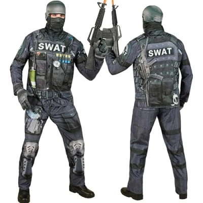 Realistic insert look: detailed imprint with badge, equipment and protective plates gives the costume an authentic appearance and provides impressive effect Comfort meets fit: made from lightweight polyester and available in size XL, the costume sits comfortably and offers ample freedom of movement - even during longer events QUICK READY TO USE This set is more than a disguise - it's a cleverly assembled fast costume that includes all the pieces in the package, you just slip in and are ready for their appearance right away COMPLETE COSTUME SET The set includes top, pants, gloves and mask - all pieces are coordinated to create a uniform SWAT look Impressive on any occasion: whether for Halloween, carnival or theme parties - this costume attracts attention, creates a good mood and will be remembered, Manufacturer: Widmann S.r.l.