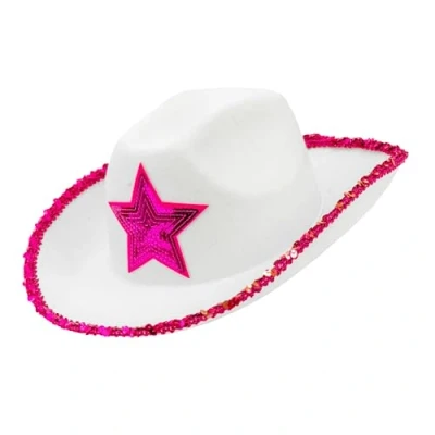 Stylish cowgirl hat: in bright white with pink star and glittering pink sequin trim - a real eye-catcher With practical drawstring: the hat can hang casually on the back when not wearing Versatile use: for carnival, festivals, theme parties or as a highlight at any hen party Wearing comfort: comfortable to wear and easy to match with different cowgirl and western outfits Party Atmosphere Adds a playful, cheeky touch to any look and make you the star of any party, Manufacturer: Widmann S.r.l.