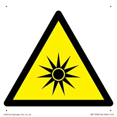 W027 : Optical radiation This sign is made from plastic semi rigid 1mm self adhesive Comes with3mm Corner Holes. S10 square Sign Text:
