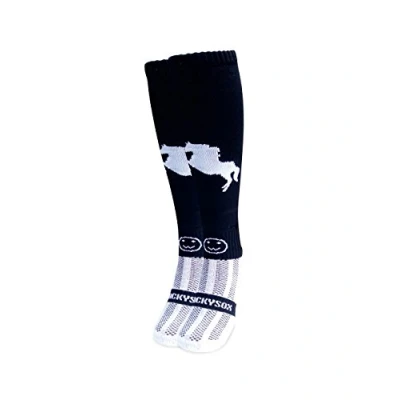 PLEASE CHOOSE SIZE CAREFULLY. SIZING OPTIONS ARE # Extra Small ( XS ) which is Child Shoe Size 9-12 # Small ( S ) which is Child Shoe Size 12-2 # Medium ( M ) which is Adult Shoe Size 2-6 # Large ( L ) which is Adult Shoe Size 7-11 # Extra Large ( XL ) which is Adult Shoe Size 11-14 # Extra Extra Large ( XXL ) which is Adult Shoe Size 14-18 RIDE IN COMFORT: Make a statement with our bold, colourful equestrian riding socks! These knee-length sports socks are ideal for horse riding and general fitness with a fully elasticated top so you don't have to worry about the socks falling down. MOISTURE-WICKING TECHNOLOGY: All our equestrian riding socks have COOLMAX Pro ultra-high performance padded footbeds that regulate temperature, keeping your feet cool and dry throughout your ride. SUPREME COMFORT: Made in Great Britain from 95% polyamide and 5% elastane which ensures a snug and soft fit on the leg. Our equestrian riding socks also feature external smooth toe seams to make blistering a thing of the past. All our socks have an elasticated ankle for support and an elasticated central foot band to help reduce slippage. A WACKY FOR ALL: Whether you ride for your own pleasure, enjoy show jumping or dressage, we have riding socks to suit you. Our WackySox are ideal for all children, men and women with bold designs to suit every occasion. Wacky by name and appearance but certainly not in terms of function and performance.