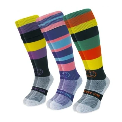 SIZING - Shoe Sizes: XS Size 9 - 12 | S Size 12 - 2 | M Size 2 - 6 | L Size 7 - 11 | XL Size 11 - 14 | XXL Size 14 - 18. Please make sure you choose the right size for you. Whether you need men's sports socks, long socks for women, or running socks men, we've got the perfect fit. PLAY IN COMFORT: Make a statement on the field with these bold multi-coloured knee-length wacky socks! These knee-length sports socks are ideal for rugby, football and hockey. They feature a fully elasticated turnover top so your socks won't fall down on match day. MOISTURE-WICKING TECHNOLOGY: All our sports socks have COOLMAX Pro ultra-high performance padded footbeds that regulate temperature, keeping your feet cool and dry throughout your match. SUPREME COMFORT: Made in Great Britain from 95% polyamide and 5% elastane which ensures a snug and soft fit on the leg, the socks can be worn with or without shin pads. Our knee-high socks also feature external smooth toe seams to make blistering a thing of the past. All our socks have an elasticated ankle for support and an elasticated central foot band to help reduce slippage. A WACKY FOR ALL: Whatever your sport or age, there's a WackySox for you. Our socks are ideal for all children, men and women with bold designs to suit every occasion. Wacky by name and appearance but certainly not in terms of function and performance.