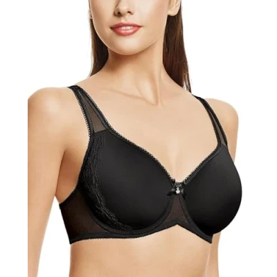 Full coverage seamless underwire T-shirt bra Supportive spacer fabric in cups Kicked in back restricted stretch straps with back release Lace side sling