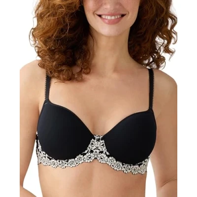 Seamless underwire t-shirt bra Stretch foam cups for a smooth silhouette Beautiful signature lace band and center Wide-set straps and low center for tops with open necklines Fully adjustable straps Hook-and-eye closure at back