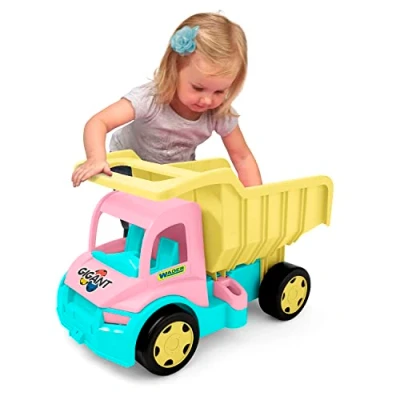 A solid and robust construction, large load capacity (with a load capacity of 150 kg). Large tipping trough with a length of 55 cm, which can be opened with a comfortable handle 2 hooks - front and rear (you can attach another vehicle or trailer from the Gigant series and a lead). Can be used to carry various items or toys Made of the highest quality, durable and weather-resistant material, safe for children, manufactured to EU standards Playing with Gigant Truck Dumper stimulates children's imagination, supports the development of their manual skills and motor coordination and introduces children to the world of colours Suitable for children over 12 months, Manufacturer: Wader-Wozniak Sp. z o.o.