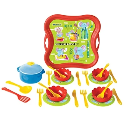 The set contains 25 pieces: a tray with handle, 4 plates, 4 bowls, a saucepan with lid, 4 cutlery and 2 kitchen spatulas All parts are made from certified, durable and safe elements according to EU standards, thanks to which they are safe and suitable for contact with food The set offers the possibility to play in peer groups, family or alone Playing with dinner time stimulates the child's imagination and creative thinking and develops interpersonal skills and improves hand-eye coordination, motor skills, manual and precise movements. It also has an educational dimension, such as B. Table behavior, correct handling of dishes Suitable for ages 1 year and up, Manufacturer: Wader-Woźniak Sp. z o.o.
